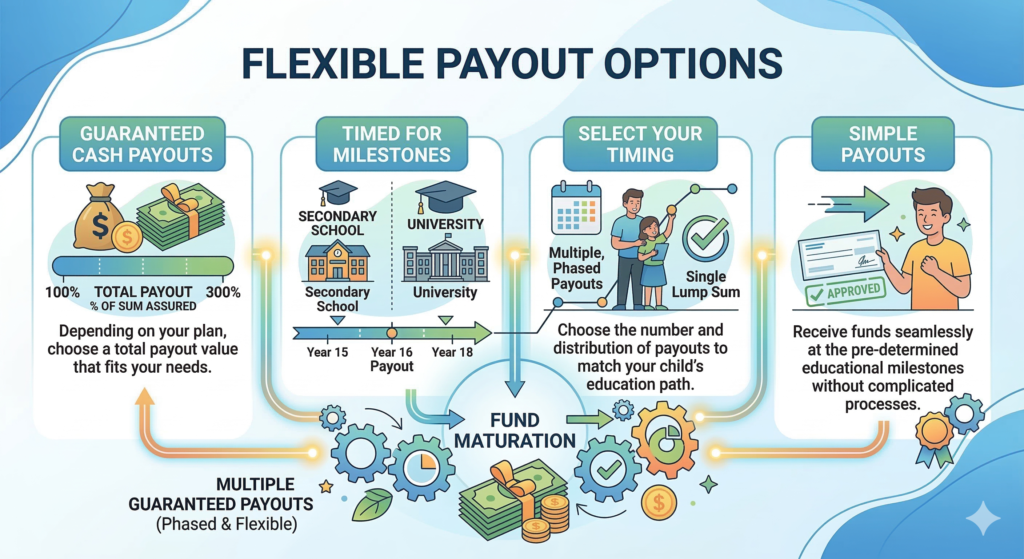 Depending on the plan you can choose guaranteed cash payouts totaling between 100% and 300% of the sum assured. These are timed to coincide with education milestones.