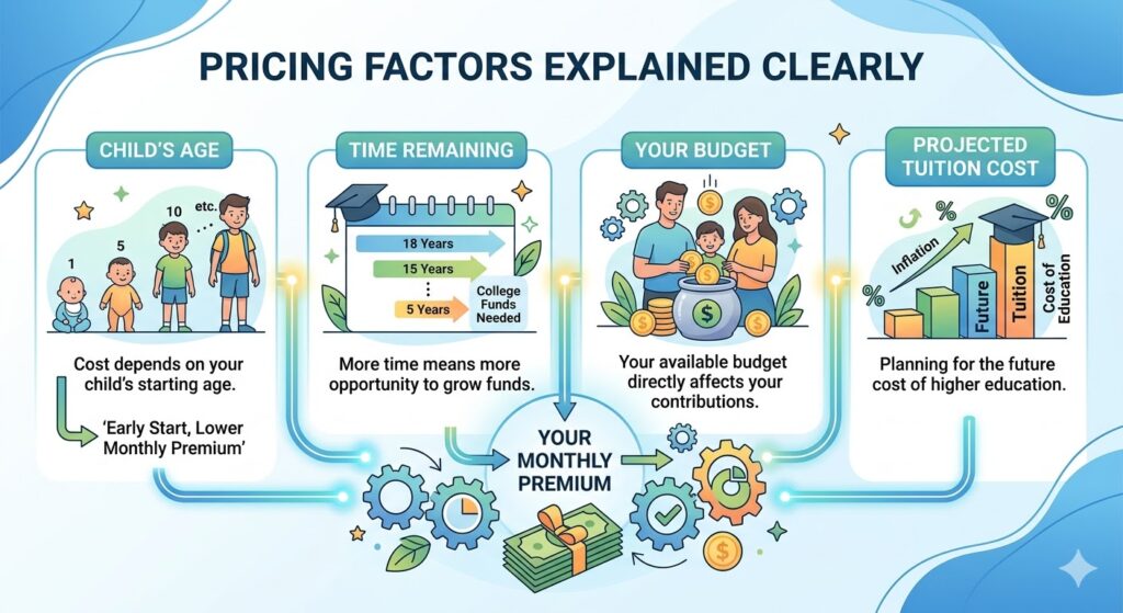 The cost is determined by your child’s age and the time remaining until they need the funds. Your budget and the projected future cost of tuition directly influence your monthly premium.